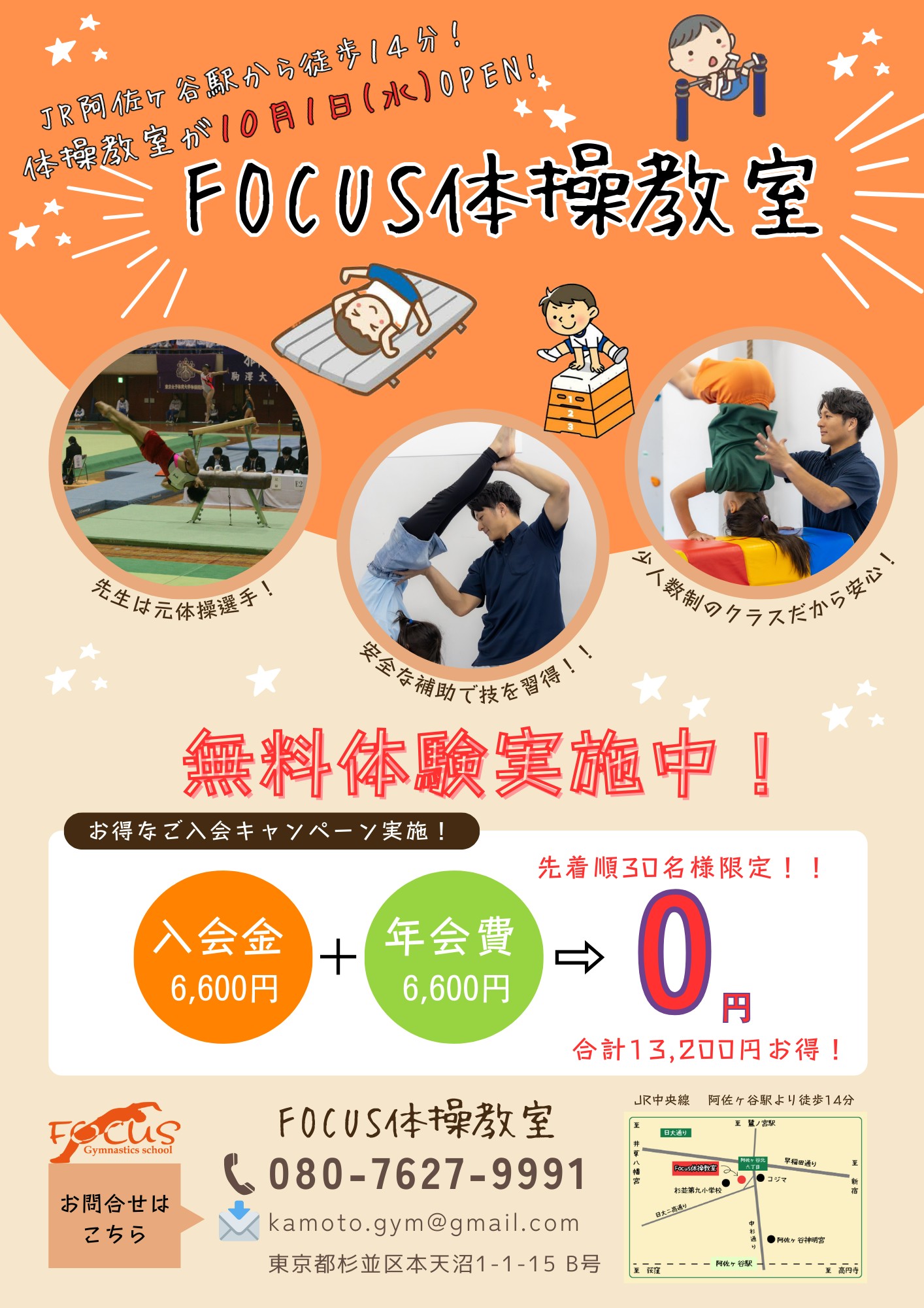 FOCUS体操教室では、お気軽に来ていただけるように無料体験レッスンを実施いたしております。「どんな雰囲気の教室なのだろう?」「どんな先生が教えているの?」「通ってみたいけど、いきなり入会は・・・」などをお考えの方も、ぜひ一度当教室へお越しください♪お待ちいたしております!